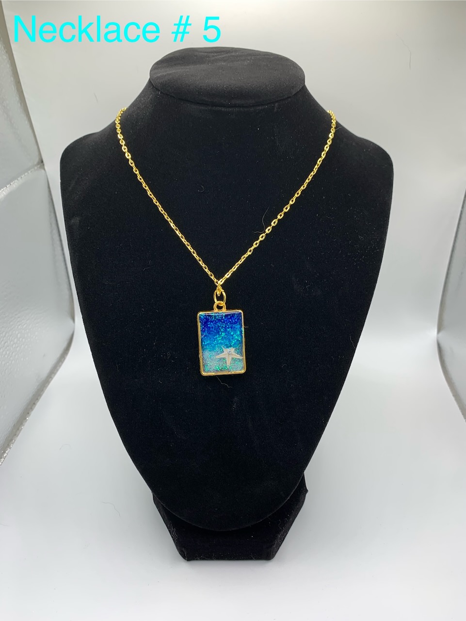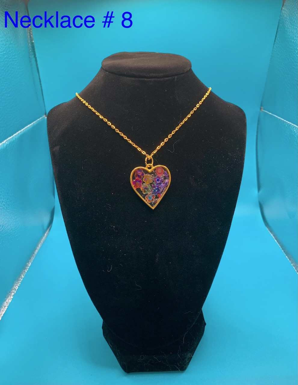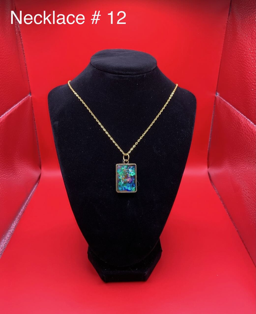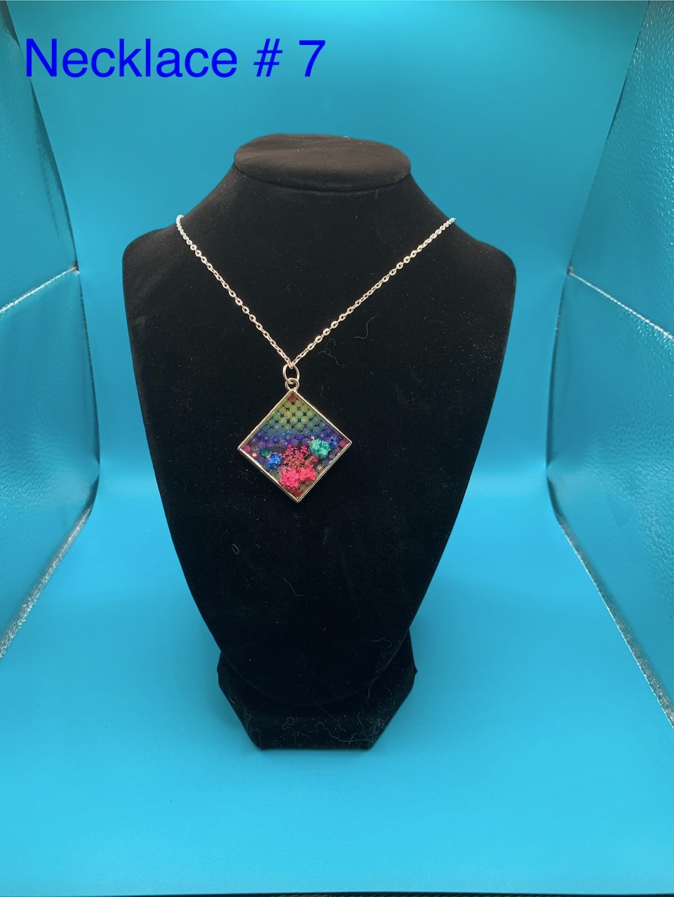 Once the resin sets, she attaches each pendant to a chain to create a unique piece of jewelry.
