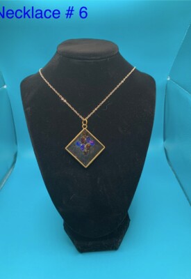 Once the resin sets, she attaches each pendant to a chain to create a unique piece of jewelry.